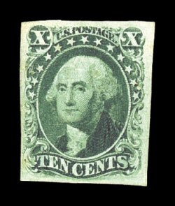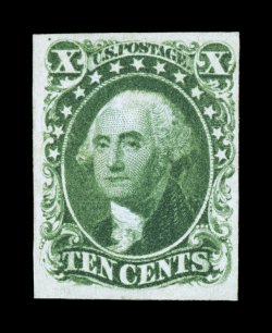 20 og 15 image#15, 10c Green, Ty. III, four large to very large margins, strong rich color and a well defined impression, full o.g., lightly hinged, recent certificate states "a natural horizontal bend at upper left and faint soiling in the vignette", both of which are quite trivial, extremely fine appearance; a rarely offered mint stamp; clear 1992 PF certificate and a 2007 PF certificate. (Image) $5,500.00