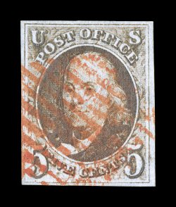 2 O 1 image#1, 5c Red brown, four full to large margins, deep rich color and a highly detailed impression, bright red grid cancels, choice very fine; 1999 PF certificate. (Image) $600.00