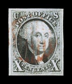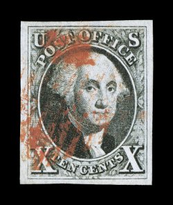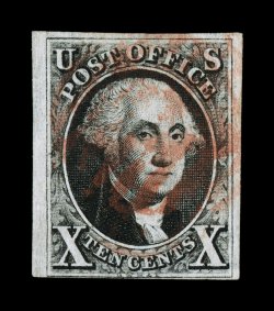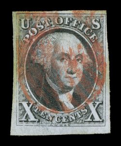 4 O 2 image#2, 10c Black, a most impressive used single, with large balanced margins all around, strong color and well incised impression which are nicely contrasted by the bright red grid cancellation, extremely fine; a lovely stamp; 1999 PF certificate. (Image) $1,400.00