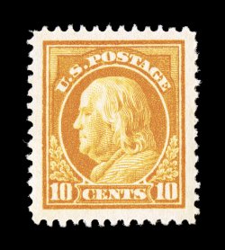 262 ogu 416 image#416, 10c Orange yellow, marvelously well centered within immense margins, gorgeous radiant color on fresh white paper, o.g., lightly hinged, extremely fine; an especially large-margined gem; 2005 PSE certificate (XF-Superb 95 Jumbo; SMQ $165.00 for 95 and $350.00 for 98). (Image) $45.00
