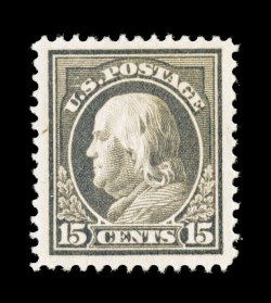 277 ogu 437 image#437, 15c Gray, an incredibly choice mint example that possesses mathematically precise centering within uncharacteristically large margins, lovely rich color and a sharp impression on pristine white paper, o.g., lightly hinged, a superb gem; 1996 PF certificate and a 2007 PSE certificate (Gem 100; SMQ $870.00 for 98); this is the sole example of #437 to receive the exalted Gem 100 grade, being the highest awarded to any stamp from the Perf. 10 watermarked series (one of only three in the series to be so graded). (Image) $135.00