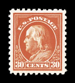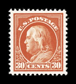 280 ogu 439 image#439, 30c Orange red, beautiful mint single, featuring eye-arresting color that is incredibly deep and intense, razor-sharp impression on bright paper, extraordinarily well centered within large margins, an extremely fine gem; 2004 PSE certificate (Superb 98; SMQ $1,550.00); this is the sole copy of #439 to grade 98, the highest in the PSE population report. (Image) $260.00
