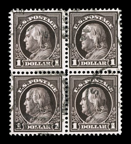 269 Obl 423 image#423, $1.00 Violet brown, premium used block of four, well centered, rich deep color and prooflike impression, unobtrusively cancelled with duplex cancels, choice very fine; an unusually rare used block of this high value, especially in this select quality; 2005 PF certificate. (Image) $800.00