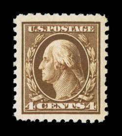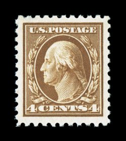 272 nhu 427 image#427, 4c Brown, exceedingly well centered mint single amid immense margins, rich color and a sharp impression, o.g., n.h., extremely fine and choice; encapsulated PSE certificate (XF 90 Jumbo; SMQ $290 for 90 and $990 for 95). (Image) $80.00