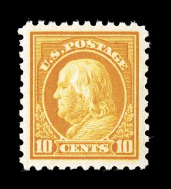 276 ogu 433 image#433, 10c Orange yellow, excellent centering within lavishly large margins, gorgeous intense color, o.g., lightly hinged, extremely fine; 2003 PSE certificate (XF-Superb 95 Jumbo; SMQ $170.00 for 95 and $345.00). (Image) $50.00