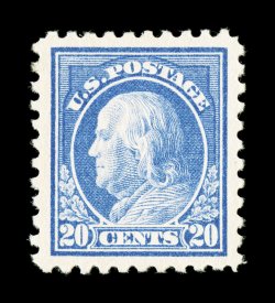 279 ogu 438 image#438, 20c Ultramarine, a marvelous mint single, featuring extraordinary centering within especially large and symmetrical margins, beautiful rich color on brilliantly white paper, o.g., lightly hinged, superb; 1999 PF certificate and a 2007 PSE certificate (Superb 98 Jumbo; SMQ $1,300.00 for 98); this is the highest grade given to this stamp by the PSE and the only example to achieve Superb 98 Jumbo status. (Image) $220.00