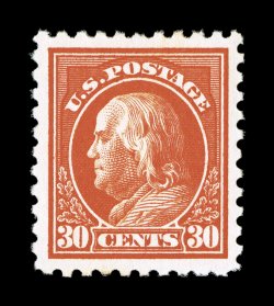 281 ogu 439 image#439, 30c Orange red, lovely mint single possessing incredibly intense color and a razor-sharp impression on bright white paper, exceptionally well centered and margined, o.g., lightly hinged, extremely fine and striking; 2007 PSE certificate (XF-Superb 95; SMQ $780.00). (Image) $260.00