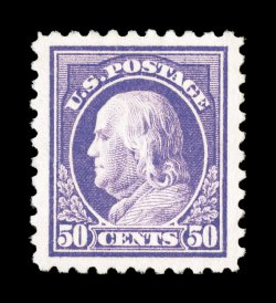 282 ogu 440 image#440, 50c Violet, an especially handsome mint single, precisely centered within symmetrically large margins, sumptuously rich color and a deeply etched impression on pristine white paper, o.g., lightly hinged, an extremely fine gem; this high value is rarely encountered this well centered and margined; 2005 PSE certificate (Superb 98; SMQ $2,850.00); the highest grade the PSE has assigned to this stamp. (Image) $575.00