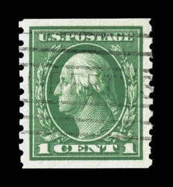 284 Ou 443 image#443, 1c Green flat plate coil, perf. 10 vert., a fabulous quality used single of this coil, which is actually a very challenging stamp to find in gem used condition, absolutely perfectly centered within large margins, deep luxuriant color and a prooflike impression on bright white paper, light machine cancel, a superb gem in every regard; the difficult in obtaining gem used copies of this coil can be found in the fact that PSE does not price anything higher than a 90 (at $135.00); 2007 PSE certificate (Gem 100); this is by far the highest grade the PSE has assigned to a used #442, and the only example (mint or used) to receive the impressive Gem 100 designation. (Image) $40.00
