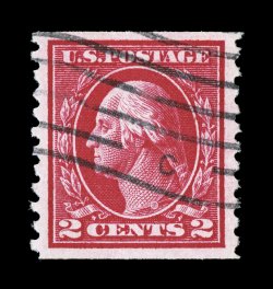 286 Ou 444 image#444, 2c Carmine flat plate coil, perf. 10 vert., attractive used single, with deep radiant color and impression, exceptionally well centered within wide margins, extremely fine; 2007 PSE certificate (XF 90; SMQ $150.00 - which is the highest grade they price for a used #444). (Image) $25.00