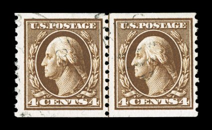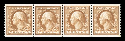 291 nh 457 image#457, 4c Brown rotary coil, perf. 10 vert., joint line strip of four, marvelously well centered and margined throughout, particularly the joint line pair, especially bright color and a clean impression, o.g., n.h., natural gum inclusion in the right stamp, extremely fine; clear 2005 PSE certificate. (Image) $435.00+