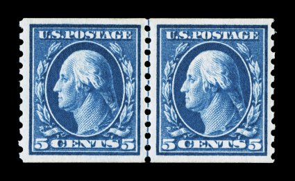 288 ogu 447 image#447, 5c Blue flat plate coil, perf. 10 vert., guide line pair, deep luxuriant color and an intense impression on fresh white paper, well centered and margined, o.g., lightly hinged, extremely fine; 2006 PSE certificate (XF 90; SMQ $385.00). (Image) $260.00