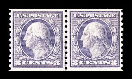 290 og 456 image#456, 3c Violet rotary coil, Ty. I, perf. 10 vert., an incredibly choice example of this very scarce joint line pair, uncommonly well centered, wonderfully fresh color and paper, o.g., barest trace of hinging (if any), extremely fine; 2001 PF certificate ("never hinged") and a 2006 PSE certificate. (Image) $1,250.00