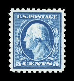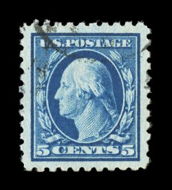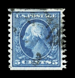 292 Ou 458 image#458, 5c Blue rotary coil, perf. 10 vert., exceptionally well centered and margined, deeply rich color, mostly face-free cancel, extremely fine; 2007 PSE certificate (XF-Superb 95; SMQ $190.00); the highest grade given to a used #458. (Image) $22.50