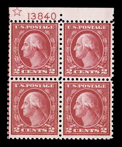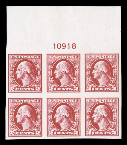 361 nhPB 532 image#532, 2c Carmine rose, Ty. IV, full top margin plate no. 10918 block of six, with an extra-large sheet margin, other margins are large and balanced as well, deep rich color, unblemished o.g., n.h., extremely fine. (Image) $625.00