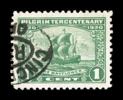 373 Ou 548 image#548, 1c Pilgrim Tercentenary, a matchless quality used single, flawlessly centered amid extravagantly large margins all around, strong rich color and a crisp impression, well struck Cincinnati registry oval cancel, a superb gem; 2007 PSE certificate (Superb 98 Jumbo; SMQ $285.00 for 98); not only is this the highest grade the PSE has awarded to any Pilgrim Tercentenary stamp (mint or used), it is the only used example of the set to grade 98J. (Image) $2.25