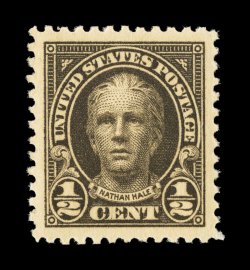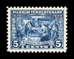 374 nhu 550 image#550, 5c Pilgrim Tercentenary, a most remarkable mint example, being fabulously well centered within especially wide margins, plus its color is deep and luxuriant, while its impression is superbly detailed on brilliantly white paper, o.g., n.h., a superb gem in the finest possible condition; 2007 PSE certificate (Superb 98 Jumbo; SMQ $2,300.00 for 98); this is the sole example of #550 to grade 98J, the highest grade awarded to any stamp of this series, making this a "must have" for someone attempting to assemble the highest graded set. (Image) $110.00