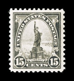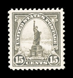 386 nhu 566 image#566, 15c Gray, near perfect centering within uncharacteristically wide margins, strong fresh color, pristine o.g., n.h., extremely fine gem; 2004 PSE certificate (XF-Superb 95 Jumbo; SMQ $370.00 for 95 and $1,100.00 for 98). (Image) $42.50