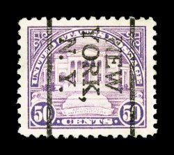 392 Ou 570 image#570, 50c Lilac, flawlessly centered within enormously large margins, strong rich color and a crisp impression, neatly struck New York pre-cancel, superb; a striking used gem; 2004 PSE certificate (Superb 98 Jumbo; SMQ $165.00 for 98); this is the only used example to grade 98J, the highest in the PSE report. (Image) $0.40