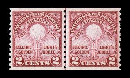 443 nhu 656 image#656, 2c Electric Light Jubilee, joint line pair, very well centered and margined, strong color, o.g., n.h., extremely fine; 2007 PSE certificate (XF 90; SMQ $230.00). (Image) $110.00