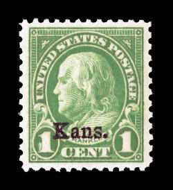 444 nhu 658 image#658, 1c "Kans." ovpt., excellent centering within remarkably wide margins for this series, lovely rich color, unblemished o.g., n.h., extremely fine; 2005 PSE certificate (XF-Superb 95 Jumbo; SMQ $105.00 for 95 and $410.00 for 98). (Image) $4.00