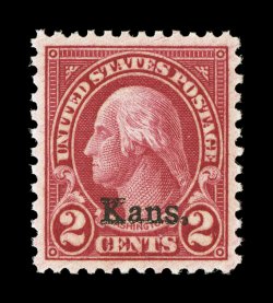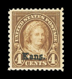 447 nhu 662 image#662, 4c "Kans." ovpt., incredibly well centered within much wider margins than typically found, deeply rich color and a highly detailed impression, pristine o.g., n.h., an extremely fine gem; 2007 PSE certificate (Superb 98; SMQ $1,300.00); one of five to grade Superb 98, the highest the PSE has given this stamp. (Image) $37.50