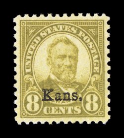 451 ogu 666 image#666, 8c "Kans." ovpt., excellent centering within uncharacteristically large margins, strong rich color, o.g., relatively lightly hinged, extremely fine; 2007 PSE certificate (XF-Superb 95; SMQ $205.00). (Image) $95.00