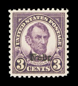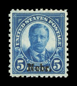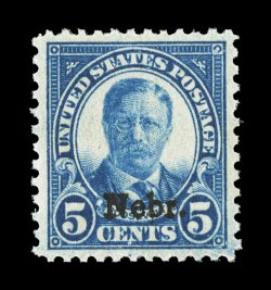 455 nhu 674 image#674, 5c "Nebr." ovpt., extraordinarily well centered and margined, intense color in a deep shade, o.g., n.h., extremely fine; 1998 PF certificate and a 2007 PSE certificate (XF-Superb 95; SMQ $380.00). (Image) $32.50