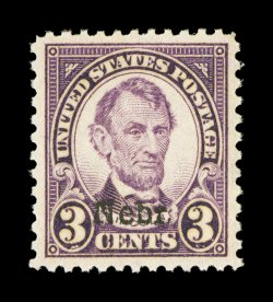452 nhu 672 image#672, 3c "Nebr." ovpt., marvelously well centered and margined, deep vibrant color and an excellent clarity of impression, o.g., n.h., extremely fine; a highly desirable example; 1984 PF certificate and a 2007 PSE certificate (Superb 98; SMQ $1,050.00). (Image) $24.00