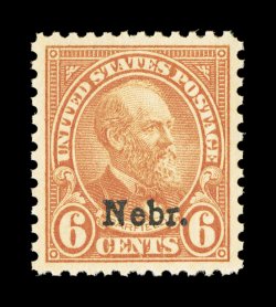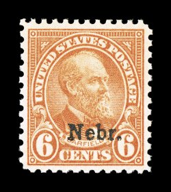 457 nhu 675 image#675, 6c "Nebr." ovpt., excellent centering within large margins, brilliantly fresh color, o.g., n.h., extremely fine; 2007 PSE certificate (XF-Superb 95; SMQ $750.00). (Image) $75.00