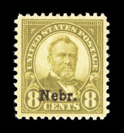 460 nhu 677 image#677, 8c "Nebr." ovpt., wonderfully well centered within large margins, deep rich color and a well incised impression, unblemished o.g., n.h., extremely fine; 2007 PSE certificate (XF-Superb 95; SMQ $670.00). (Image) $65.00