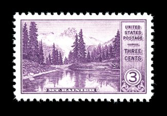 483 nhu 742 image#742, 3c Mount Rainier, perfectly balanced margins all around, bright fresh color, o.g., n.h., an extremely fine gem; 2007 PSE certificate (Superb 98; SMQ $200.00). (Image) $0.25