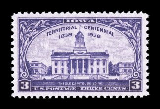 492 nhu 838 image#838, 3c Iowa Territory, perfectly symmetrical margins all around, deep intense color and impression, o.g., n.h., a superb gem; 2006 PSE certificate (Gem 100; SMQ $300.00); one of only two examples to receive this prestigious grade. (Image) $0.30