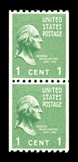 495 nhu 848 image#848, 1c Green coil, gem mint pair, perfectly centered within large margins, deep rich color, o.g., n.h., superb; 2007 PSE certificate (Gem 100; SMQ $400.00); the highest grade given to this stamp, being one of only two pair to receive the exalted Gem 100 grade. (Image) $1.75