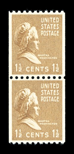 496 nhu 849 image#849, 1 1/2c Bister brown coil, flawless mint pair, precisely centered within large margins, lovely rich color, o.g., n.h., superb; 2007 PSE certificate (Gem 100; SMQ $435.00); one of only two examples of #849 to receive the Gem 100 designation (both are pairs), the highest grade assigned to this stamp. (Image) $2.50