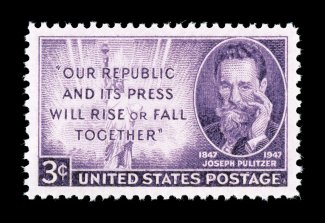 498 nhu 946 image#946, 3c Joseph Pulitzer, absolutely perfect centering within large margins, deep vibrant color, o.g., n.h., a superb gem; 2006 PSE certificate (Gem 100; not listed in SMQ); this is the sole example in the PSE population report to receive the coveted Gem 100 designation. (Image) $0.20