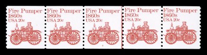 502 nh 1908 image#1908, 20c Fire pumper, plate no. 2 strip of five, bright and fresh, o.g., n.h., very fine; one of the scarcer plate number strips of the Transportation series; 2003 PF certificate. (Image) $800.00