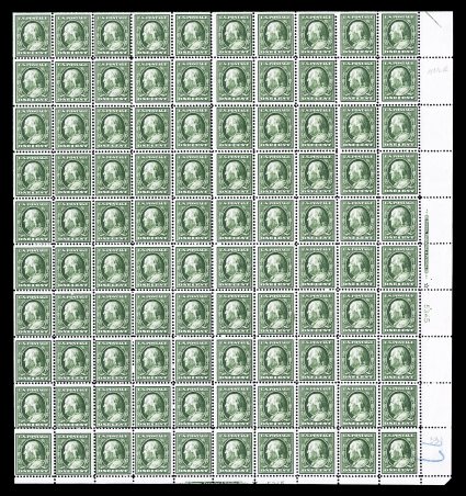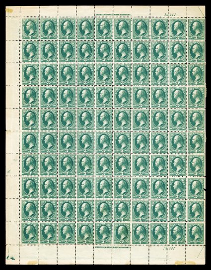 515 nhbl 331 image#331, 1c Green, imprint, star and plate no. 5345 pane of 100, with short bottom margin (not cataloged as a plate block), strong rich color, o.g., n.h., small blue crayon mark at bottom right, fine-very fine. (Image) $1,780.00