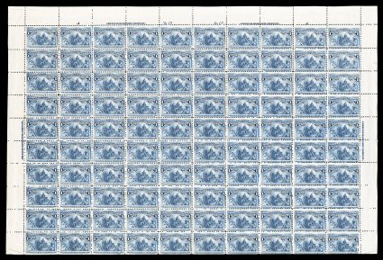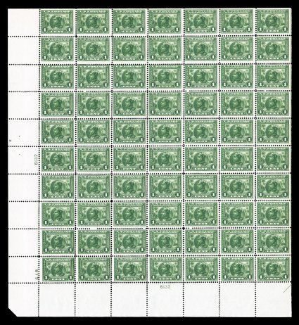510 nhbl 294 image#294, 1c Pan-American, imprint, arrow and plate no. 1123 pane of 100, lovely rich colors, o.g., n.h., some perf. reinforcing at bottom between ninth and tenth columns, the bottom left selvage "square" has been added with hinges, overall fine-very fine; a very scarce early 20th century commemorative sheet. (Image) $4,910.00
