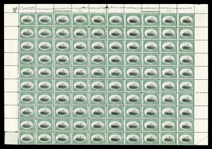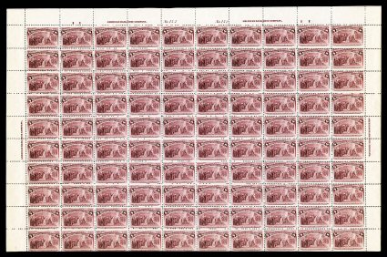 505 nhbl 236 image#236, 8c Columbian, imprint, letters "II" and plate "No. 132" pane of 100, rich luxuriant color, o.g., n.h., about half the perfs. between the third and fourth rows are separated, small trivial crease in the top selvage, fine centering; an extremely rare commemorative sheet, being one of only a handful of Eight Cent Columbians that still exist in a full pane of 100 stamps. (Image) $21,800.00