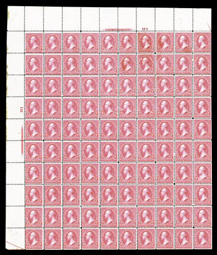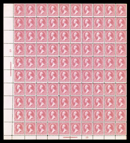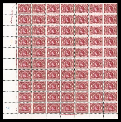 506 nhbl 248 image#248, 2c Pink, Ty. I, imprint and plate no. 19 pane of 100, bright fresh color, o.g., n.h., a few minor gum skips and a couple small natural gum wrinkles, fine; a very rare sheet, being one of only a small number of Unwatermarked Bureau sheets still intact. (Image) $9,050.00