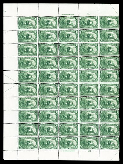508 nhbl 285 image#285, 1c Trans-Mississippi, imprint and plate no. 591 pane of 50, deep rich color, o.g., n.h., light horizontal crease in the eighth row of stamps, some minor perf. reinforcement between eighth and ninth rows, bottom selvage with some gum skips and shallow thin in the bottom left selvage, fine-very fine appearance. (Image) $4,390.00