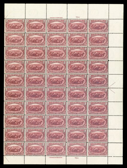 509 nhbl 286 image#286, 2c Trans-Mississippi, imprint and plate no. 724 pane of 50, with large sheet selvages, o.g., n.h., fine-very fine. (Image) $4,390.00