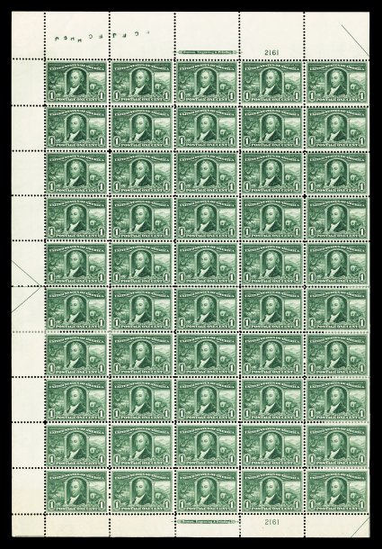 511 og/nhbl 323 image#323, 1c Louisiana Purchase, imprint and plate no. 2161 pane of 50, especially deep color, o.g., n.h. except eleven stamps affected by hinge reinforcements (mainly along the right straight-edge column), a couple hinge reinforcements in bottom selvage affecting the plate block, fine-very fine. (Image) $3,020.00