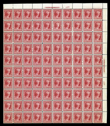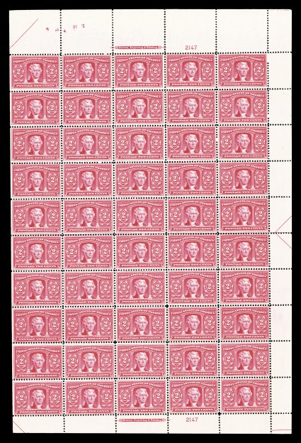516 og/nhbl 367 image#367, 2c Lincoln, a seldom seen imprint and plate no. 4977 pane of 100, many well centered stamps, o.g., n.h. except for some hinge reinforcements between the seventh and eighth columns, very fine overall. (Image) $1,393.50