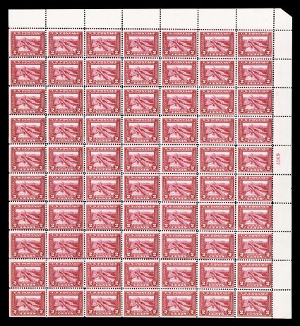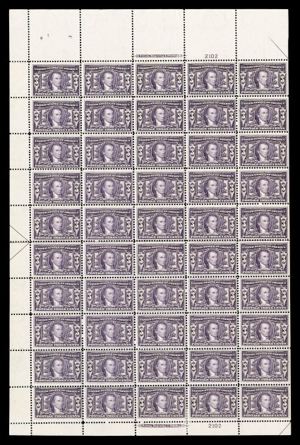 513 og/nhbl 325 image#325, 3c Louisiana Purchase, imprint and plate no. 2102 pane of 50, with a particularly large selvage at top, strong rich color, o.g., n.h. except a small hinge reinforcement on the bottom row between the third and fourth stamps, fine; a rare commemorative sheet, with values from this series higher than the 2c being especially elusive. (Image) $10,680.00