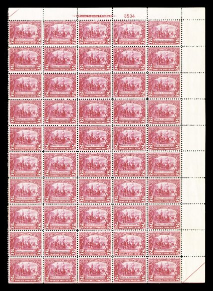 514 og/nhbl 329 image#329, 2c Jamestown, imprint and plate no. 3504 pane of 50, vibrant color, o.g., n.h. except seven stamps affected by perf. reinforcing, also some minor reinforcing in the top selvage, fine-very fine. (Image) $3,705.00