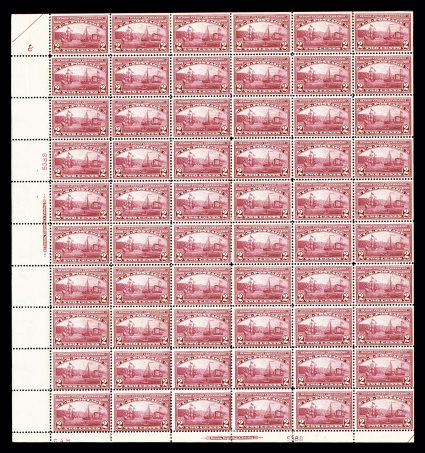 520 og/nhbl 398 image#398, 2c Panama-Pacific, plate no. 6307 pane of 60, deep vibrant color, o.g., stamps all n.h., small hinge mark in right selvage between fourth and fifth rows, fine; a rather scarce commemorative sheet. (Image) $2,780.00