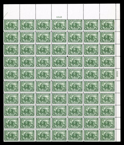 521 nhbl 401 image#401, 1c Panama-Pacific, perf. 10, plate no. 6548 pane of 70, fresh color, o.g., n.h., bottom left stamp lightly creased, small mark in the top right margin, fine; the perf. 10 Panama-Pacifics are especially elusive to find in full sheets. (Image) $4,925.00
