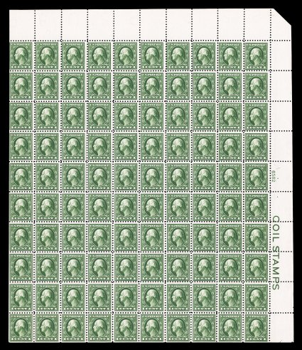522 nhbl 424 image#424, 1c Green, "COIL STAMPS" imprint and plate no. 6582 pane of 100, marvelously bright and fresh, o.g., n.h., fine-very fine. (Image) $692.50